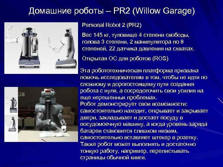 Домашние роботы – PR 2 (Willow Garage) Personal Robot 2 (PR 2) Вес 145 кг, туловище 4 степени свободы, голова 3 степени, 2 манипулятора по 8 степеней, 22 датчика давления на схватах. Открытая ОС для роботов (ROS) Эта робототехническая платформа призвана помочь исследователям в том, чтобы не идти по сложному и дорогостоящему пути создания робота с нуля, а сосредоточить свои усилия на еще нерешенных проблемах. Робот демонстрирует свои возможности: самостоятельно находит, открывает и закрывает двери, закладывает и достает посуду в посудомоечную машину, а когда уровень заряда батареи становится слишком низким, самостоятельно вставляет штекер в розетку. Также робот может выполнять и достаточно тонкую работу, например, перелистывать страницы обычной книги.