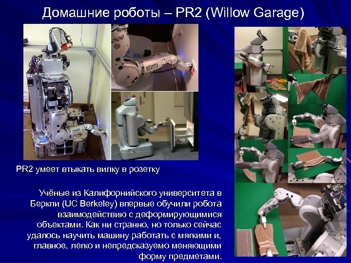 Домашние роботы – PR 2 (Willow Garage) PR 2 умеет втыкать вилку в розетку Учёные из Калифорнийского университета в Беркли (UC Berkeley) впервые обучили робота взаимодействию с деформирующимися объектами. Как ни странно, но только сейчас удалось научить машину работать с мягкими и, главное, легко и непредсказуемо меняющими форму предметами.