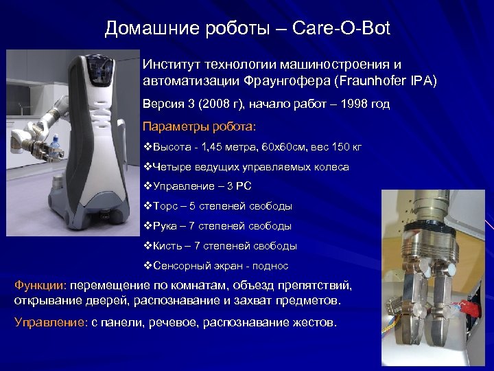 Домашние роботы – Care-O-Bot Институт технологии машиностроения и автоматизации Фраунгофера (Fraunhofer IPA) Версия 3 (2008 г), начало работ – 1998 год Параметры робота: v. Высота - 1, 45 метра, 60 х60 см, вес 150 кг v. Четыре ведущих управляемых колеса v. Управление – 3 PC v. Торс – 5 степеней свободы v. Рука – 7 степеней свободы v. Кисть – 7 степеней свободы v. Сенсорный экран - поднос Функции: перемещение по комнатам, объезд препятствий, открывание дверей, распознавание и захват предметов. Управление: с панели, речевое, распознавание жестов.