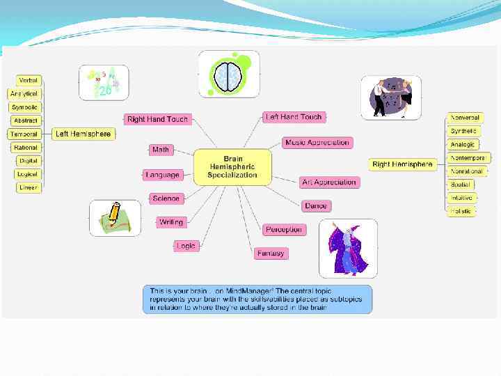 Метод интеллектуальных карт Метод позволяет представлять информацию таким образом, чтобы ее могли одновременно воспринимать и левое, и правое полушарие.