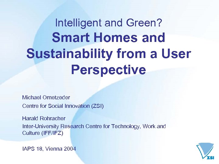 Intelligent and Green? Smart Homes and Sustainability from a User Perspective Michael Ornetzeder Centre for Social Innovation (ZSI) Harald Rohracher Inter-University Research Centre for Technology, Work and Culture (IFF/IFZ) IAPS 18, Vienna 2004