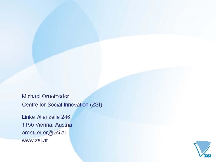 Michael Ornetzeder Centre for Social Innovation (ZSI) Linke Wienzeile 246 1150 Vienna, Austria ornetzeder@zsi. at www. zsi. at