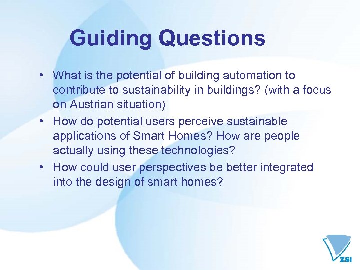 Guiding Questions • What is the potential of building automation to contribute to sustainability in buildings? (with a focus on Austrian situation) • How do potential users perceive sustainable applications of Smart Homes? How are people actually using these technologies? • How could user perspectives be better integrated into the design of smart homes?