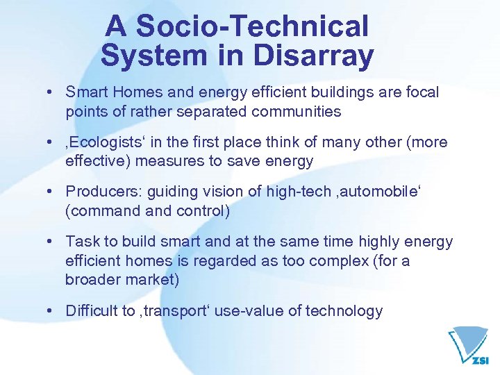 A Socio-Technical System in Disarray • Smart Homes and energy efficient buildings are focal points of rather separated communities • ‚Ecologists‘ in the first place think of many other (more effective) measures to save energy • Producers: guiding vision of high-tech ‚automobile‘ (command control) • Task to build smart and at the same time highly energy efficient homes is regarded as too complex (for a broader market) • Difficult to ‚transport‘ use-value of technology