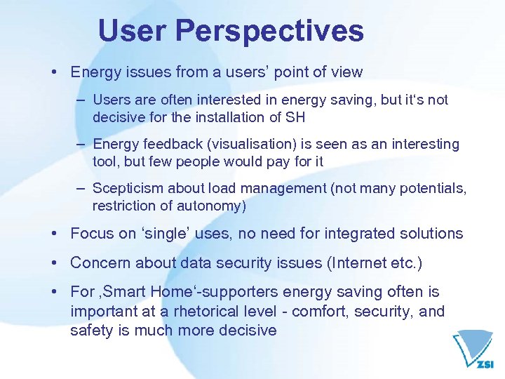User Perspectives • Energy issues from a users’ point of view – Users are often interested in energy saving, but it‘s not decisive for the installation of SH – Energy feedback (visualisation) is seen as an interesting tool, but few people would pay for it – Scepticism about load management (not many potentials, restriction of autonomy) • Focus on ‘single’ uses, no need for integrated solutions • Concern about data security issues (Internet etc. ) • For ‚Smart Home‘-supporters energy saving often is important at a rhetorical level - comfort, security, and safety is much more decisive