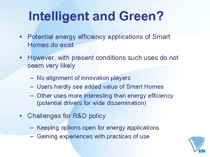 Intelligent and Green? • Potential energy efficiency applications of Smart Homes do exist • However, with present conditions such uses do not seem very likely – No alignment of innovation players – Users hardly see added value of Smart Homes – Other uses more interesting than energy efficiency (potential drivers for wide dissemination) • Challenges for R&D policy – Keeping options open for energy applications – Gaining experiences with practices of use
