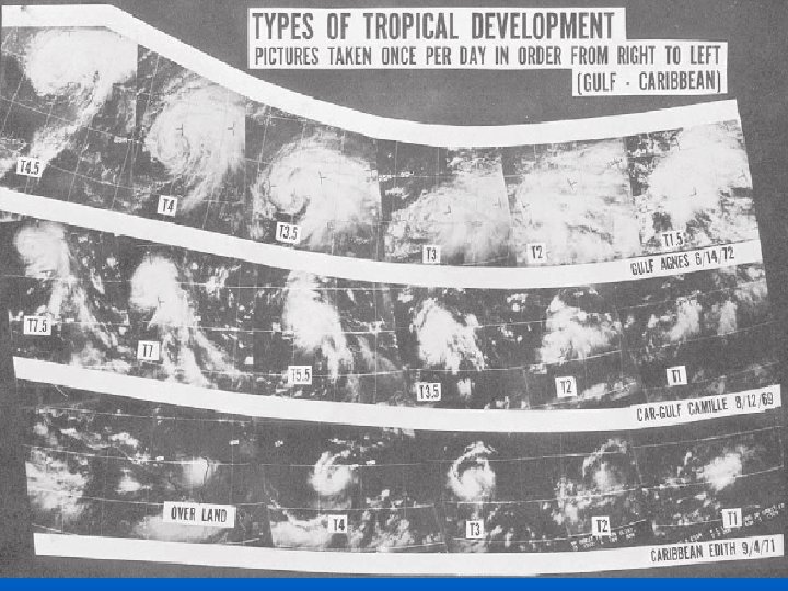 TC Death • Decay as move to higher latitude… cooler water and higher VWS most of time. • R# = U/fo. L -> decreases with greater latitude… size of storm increases. Latent heating also decreases. Pressure gradient and tangential winds decrease. • Extratropical transition possible in N Atlantic and NW Pacific. • Die over land due to loss of LH flux, often also SH flux. Increased friction reduces wind speed and may cause too much of a rapid increase in LL mass convergence for adequate evacuation via UL Div.