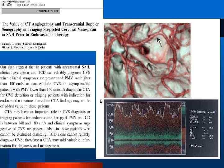 Транскраниальная допплерография (картина церебрального вазоспазма) КТ-перфузия для верификация осложненного ангиоспазма