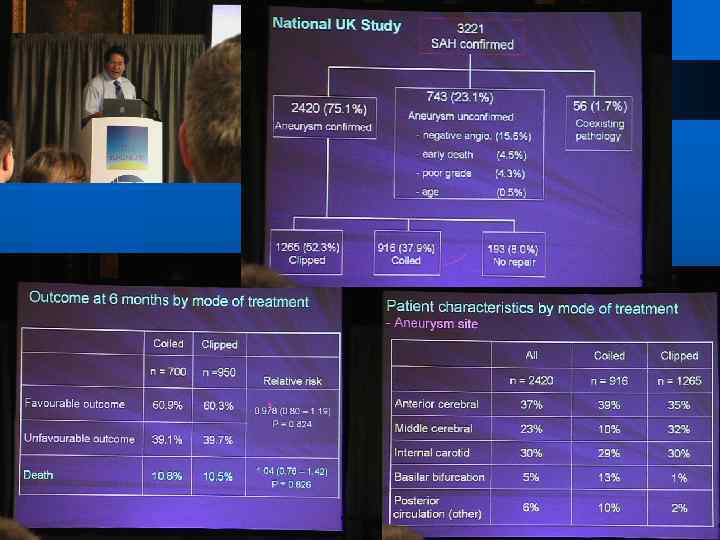 Study Provides Guidance for Treating Patients with Brain Aneurysms A December 10, 1998, issue of The New England Journal of Medicine, found that the size and location of the aneurysm in the brain, as well as the patient’s medical history, are the best predictors of future rupture. l l l Dr. Wiebers and his colleagues found that for patients who have not had a previous subarachnoid hemorrhage, the risk of rupture for aneurysms smaller than 10 millimeters (mm) or about 1/3 of an inch in diameter was very low, less than 1/20 of 1 percent per year. For patients with a history of subarachnoid hemorrhage, the risk of rupture for the same sized aneurysm is about 11 times higher, about ½ of 1 percent per year. For aneurysms between 10 and 25 mm, the risk of rupture is still quite low, slightly less than 1 percent per year for both groups. The risk of rupture for giant aneurysms (greater than 25 mm in diameter) was about 6 percent for the first year for both groups. The exact position of the aneurysm in the brain was also a predictor of rupture in both groups. Of course, the risk of rupture for an aneurysm must be compared to the overall risk of surgery to repair an aneurysm. For patients without a history of subarachnoid hemorrhage (group I), the surgery-related morbidity and mortality combined was about 17. 5 percent at 30 days and about 15. 9 percent at 1 year. For patients with a history of subarachnoid hemorrhage (group II), the combined surgery-related morbidity and mortality was less, about 13. 6 percent at 30 days and about 13. 2 percent at 1 year. One reason for this may be the average difference between the two groups. Younger patients had substantially less operative morbidity and mortality than older patients and group II patients were younger than group I patients (an average of 47 versus 53 years old). The investigators concluded that the likelihood of rupture of aneurysms less than 10 mm in diameter is exceedingly low among group I patients and that the combined morbidity and mortality rate related to surgery greatly exceeds the 7 ½ year risk of rupture in these patients. They therefore advise against surgery for most patients who have aneurysms less than 10 mm in diameter and are without a history of subarachnoid hemorrhage. Other risk factors that surgeons should take into account before performing aneurysm surgery are the patient’s history of previous subarachnoid hemorrhage, and the size and location of the aneurysm.