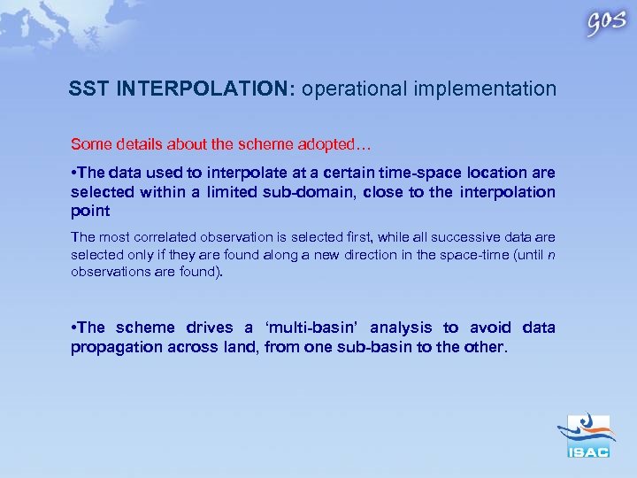SST INTERPOLATION: operational implementation Some details about the scheme adopted… • The data used to interpolate at a certain time-space location are selected within a limited sub-domain, close to the interpolation point The most correlated observation is selected first, while all successive data are selected only if they are found along a new direction in the space-time (until n observations are found). • The scheme drives a ‘multi-basin’ analysis to avoid data propagation across land, from one sub-basin to the other.