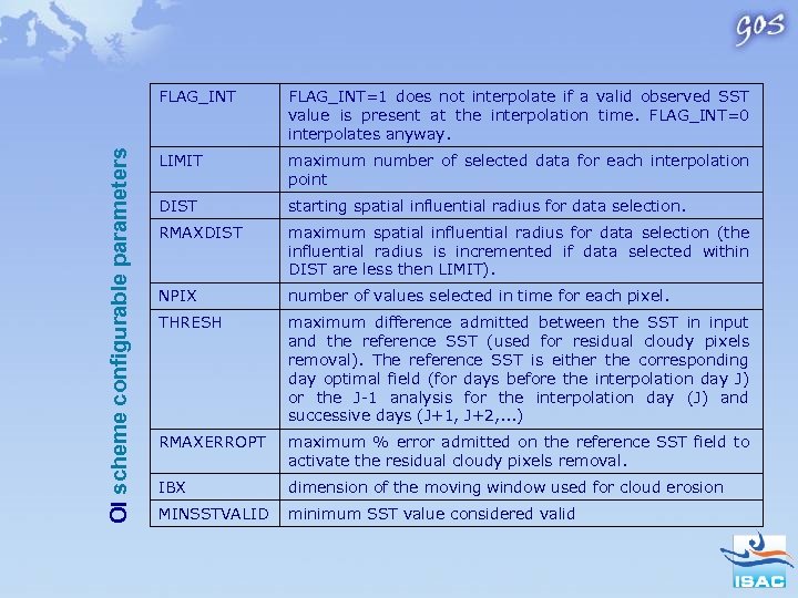 OI scheme configurable parameters FLAG_INT=1 does not interpolate if a valid observed SST value is present at the interpolation time. FLAG_INT=0 interpolates anyway. LIMIT maximum number of selected data for each interpolation point DIST starting spatial influential radius for data selection. RMAXDIST maximum spatial influential radius for data selection (the influential radius is incremented if data selected within DIST are less then LIMIT). NPIX number of values selected in time for each pixel. THRESH maximum difference admitted between the SST in input and the reference SST (used for residual cloudy pixels removal). The reference SST is either the corresponding day optimal field (for days before the interpolation day J) or the J-1 analysis for the interpolation day (J) and successive days (J+1, J+2, . . . ) RMAXERROPT maximum % error admitted on the reference SST field to activate the residual cloudy pixels removal. IBX dimension of the moving window used for cloud erosion MINSSTVALID minimum SST value considered valid