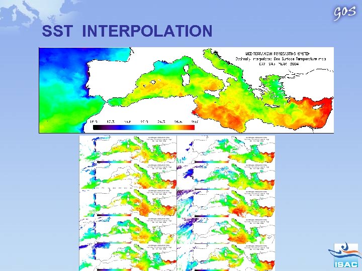 The Mediterranean GOS L 4 SST products flow chart MF AVHRR acquisition Atlantic buffer zone + west Med ISAC AVHRR acquisition Entire Mediterranean Night-time SST using MF algorithm Night-time SST using Pathfinder algorithm Cloud detection SST daily composite binning on model grid (1/16 x 1/16) L 2 P GHRSST Products Data merging ISAC Data quality controll Optimal Interpolation Data delivery on the GOS-ISAC web-site