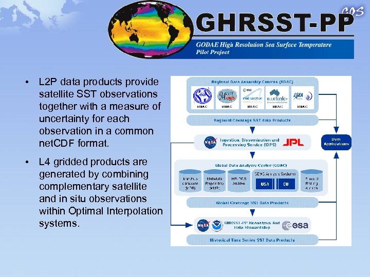 • L 2 P data products provide satellite SST observations together with a measure of uncertainty for each observation in a common net. CDF format. • L 4 gridded products are generated by combining complementary satellite and in situ observations within Optimal Interpolation systems.