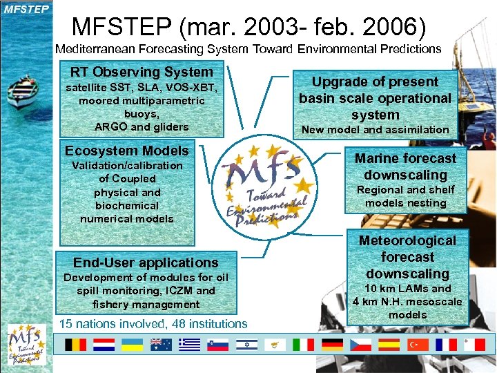 MFSTEP (mar. 2003 - feb. 2006) Mediterranean Forecasting System Toward Environmental Predictions RT Observing System satellite SST, SLA, VOS-XBT, moored multiparametric buoys, ARGO and gliders Ecosystem Models Validation/calibration of Coupled physical and biochemical numerical models End-User applications Development of modules for oil spill monitoring, ICZM and fishery management 15 nations involved, 48 institutions Upgrade of present basin scale operational system New model and assimilation Marine forecast downscaling Regional and shelf models nesting Meteorological forecast downscaling 10 km LAMs and 4 km N. H. mesoscale models