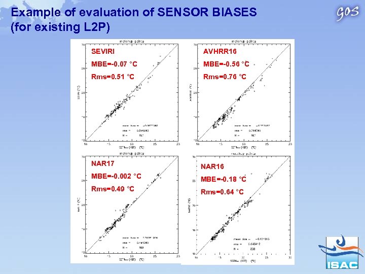 Example of evaluation of SENSOR BIASES (for existing L 2 P) SEVIRI AVHRR 16 MBE=-0. 07 °C MBE=-0. 56 °C Rms=0. 51 °C Rms=0. 76 °C NAR 17 NAR 16 MBE=-0. 002 °C MBE=-0. 18 °C Rms=0. 49 °C Rms=0. 64 °C