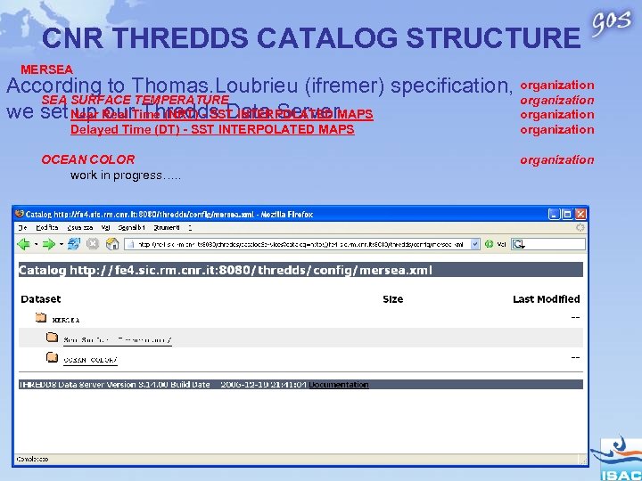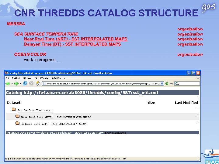 CNR THREDDS CATALOG STRUCTURE MERSEA SURFACE TEMPERATURE Near Real Time (NRT) - SST INTERPOLATED MAPS Delayed Time (DT) - SST INTERPOLATED MAPS OCEAN COLOR work in progress…. . organization organization