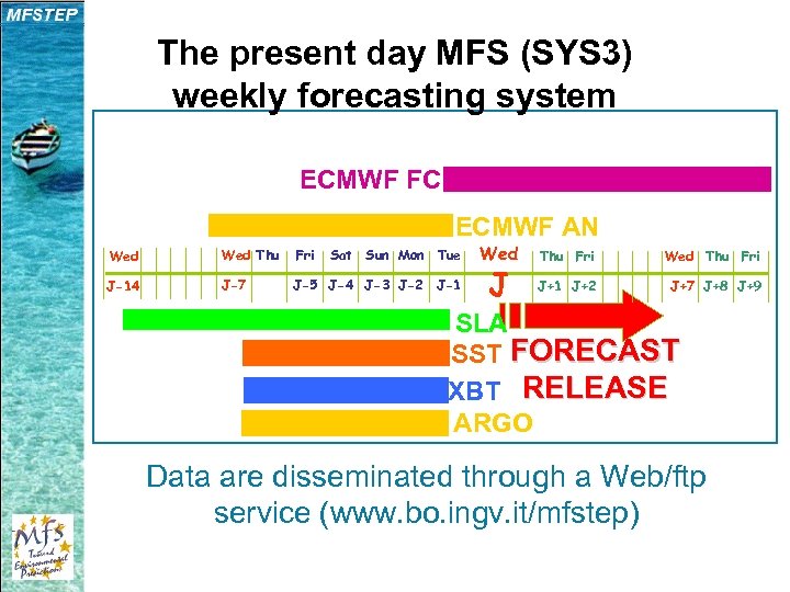 The present day MFS (SYS 3) weekly forecasting system ECMWF FC ECMWF AN Wed Thu Fri Sat Sun Mon Tue J-14 J-7 J-5 J-4 J-3 J-2 J-1 Wed J Thu Fri Wed Thu Fri J+1 J+2 J+7 J+8 J+9 SLA SST FORECAST XBT RELEASE ARGO Data are disseminated through a Web/ftp service (www. bo. ingv. it/mfstep)