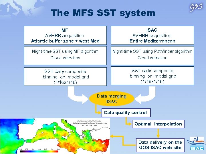 The MFS SST system MF AVHRR acquisition Atlantic buffer zone + west Med ISAC AVHRR acquisition Entire Mediterranean Night-time SST using MF algorithm Night-time SST using Pathfinder algorithm Cloud detection SST daily composite binning on model grid (1/16 x 1/16) Data merging ISAC Data quality control Optimal Interpolation Data delivery on the GOS-ISAC web-site