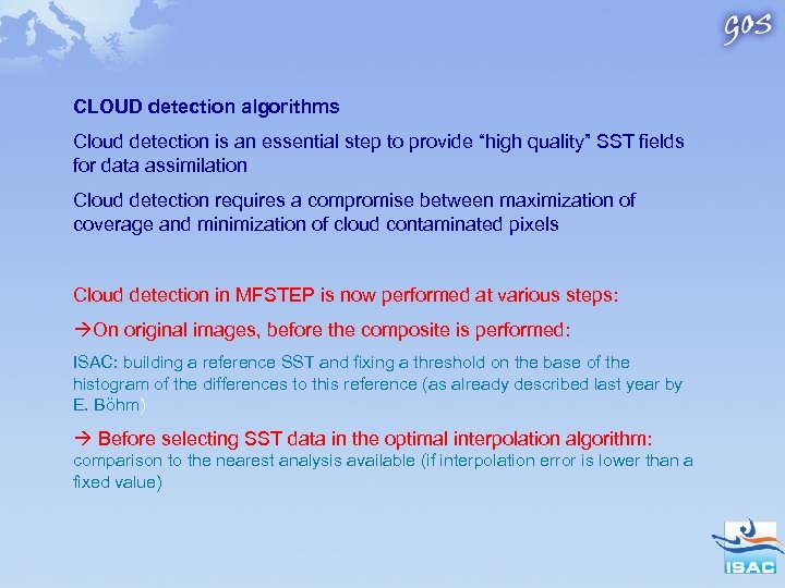 CLOUD detection algorithms Cloud detection is an essential step to provide “high quality” SST fields for data assimilation Cloud detection requires a compromise between maximization of coverage and minimization of cloud contaminated pixels Cloud detection in MFSTEP is now performed at various steps: On original images, before the composite is performed: ISAC: building a reference SST and fixing a threshold on the base of the histogram of the differences to this reference (as already described last year by E. Böhm) Before selecting SST data in the optimal interpolation algorithm: comparison to the nearest analysis available (if interpolation error is lower than a fixed value)