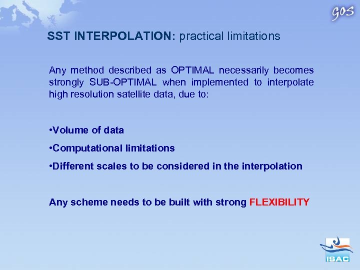 SST INTERPOLATION: practical limitations Any method described as OPTIMAL necessarily becomes strongly SUB-OPTIMAL when implemented to interpolate high resolution satellite data, due to: • Volume of data • Computational limitations • Different scales to be considered in the interpolation Any scheme needs to be built with strong FLEXIBILITY
