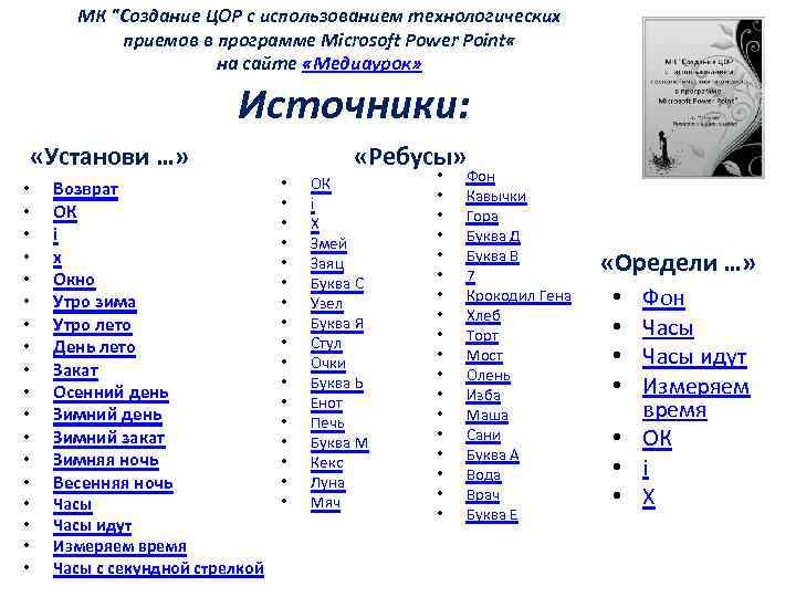 МК "Создание ЦОР с использованием технологических приемов в программе Microsoft Power Point « на сайте «Медиаурок» Источники: «Установи …» • • • • • Возврат ОК i х Окно Утро зима Утро лето День лето Закат Осенний день Зимний закат Зимняя ночь Весенняя ночь Часы идут Измеряем время Часы с секундной стрелкой «Ребусы» • • • • • ОК i Х Змей Заяц Буква С Узел Буква Я Стул Очки Буква Ь Енот Печь Буква М Кекс Луна Мяч • • • • • Фон Кавычки Гора Буква Д Буква В 7 Крокодил Гена Хлеб Торт Мост Олень Изба Маша Сани Буква А Вода Врач Буква Е «Оредели …» Фон Часы идут Измеряем время • ОК • i • Х • •