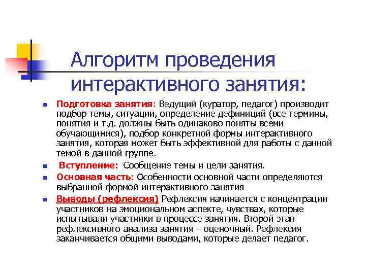 Алгоритм проведения интерактивного занятия: n Подготовка занятия: Ведущий (куратор, педагог) производит подбор темы, ситуации, определение дефиниций (все термины, понятия и т. д. должны быть одинаково поняты всеми обучающимися), подбор конкретной формы интерактивного занятия, которая может быть эффективной для работы с данной темой в данной группе. n Вступление: Сообщение темы и цели занятия. n Основная часть: Особенности основной части определяются выбранной формой интерактивного занятия n Выводы (рефлексия) Рефлексия начинается с концентрации участников на эмоциональном аспекте, чувствах, которые испытывали участники в процессе занятия. Второй этап рефлексивного анализа занятия – оценочный. Рефлексия заканчивается общими выводами, которые делает педагог.