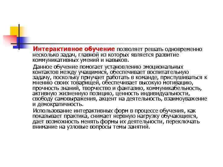 Интерактивное обучение позволяет решать одновременно несколько задач, главной из которых является развитие коммуникативных умений и навыков. Данное обучение помогает установлению эмоциональных контактов между учащимися, обеспечивает воспитательную задачу, поскольку приучает работать в команде, прислушиваться к мнению своих товарищей, обеспечивает высокую мотивацию, прочность знаний, творчество и фантазию, коммуникабельность, активную жизненную позицию, ценность индивидуальности, свободу самовыражения, акцент на деятельность, взаимоуважение и демократичность. Использование интерактивных форм в процессе обучения, как показывает практика, снимает нервную нагрузку обучающихся, дает возможность менять формы их деятельности, переключать внимание на узловые вопросы темы занятий.