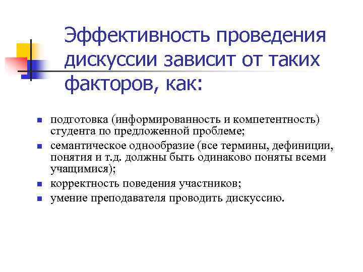 Эффективность проведения дискуссии зависит от таких факторов, как: n подготовка (информированность и компетентность) студента по предложенной проблеме; n семантическое однообразие (все термины, дефиниции, понятия и т. д. должны быть одинаково поняты всеми учащимися); n корректность поведения участников; n умение преподавателя проводить дискуссию.