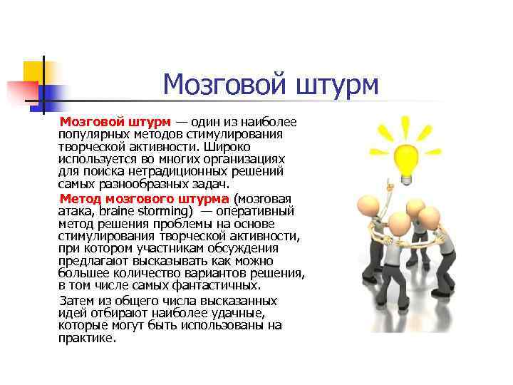 Мозговой штурм — один из наиболее популярных методов стимулирования творческой активности. Широко используется во многих организациях для поиска нетрадиционных решений самых разнообразных задач. Метод мозгового штурма (мозговая атака, braine storming) — оперативный метод решения проблемы на основе стимулирования творческой активности, при котором участникам обсуждения предлагают высказывать как можно большее количество вариантов решения, в том числе самых фантастичных. Затем из общего числа высказанных идей отбирают наиболее удачные, которые могут быть использованы на практике.