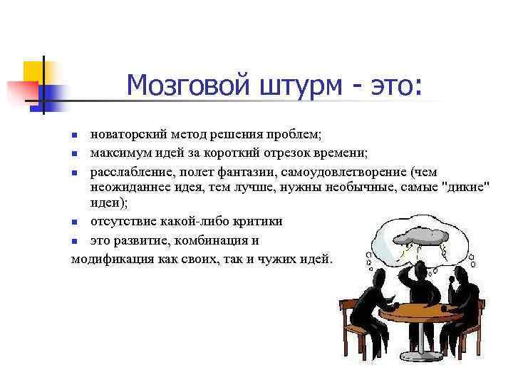 Мозговой штурм - это: n новаторский метод решения проблем; n максимум идей за короткий отрезок времени; n расслабление, полет фантазии, самоудовлетворение (чем неожиданнее идея, тем лучше, нужны необычные, самые "дикие" идеи); n отсутствие какой-либо критики n это развитие, комбинация и модификация как своих, так и чужих идей.