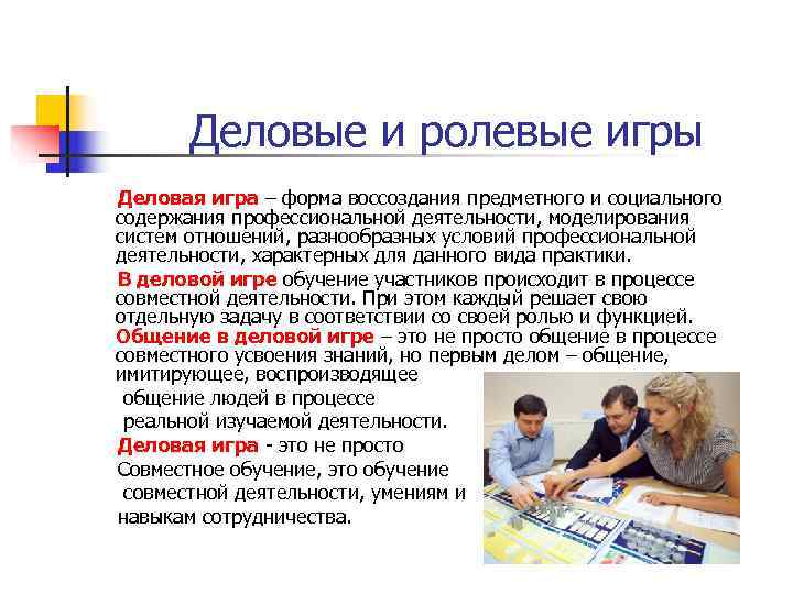 Деловые и ролевые игры Деловая игра – форма воссоздания предметного и социального содержания профессиональной деятельности, моделирования систем отношений, разнообразных условий профессиональной деятельности, характерных для данного вида практики. В деловой игре обучение участников происходит в процессе совместной деятельности. При этом каждый решает свою отдельную задачу в соответствии со своей ролью и функцией. Общение в деловой игре – это не просто общение в процессе совместного усвоения знаний, но первым делом – общение, имитирующее, воспроизводящее общение людей в процессе реальной изучаемой деятельности. Деловая игра - это не просто Совместное обучение, это обучение совместной деятельности, умениям и навыкам сотрудничества.