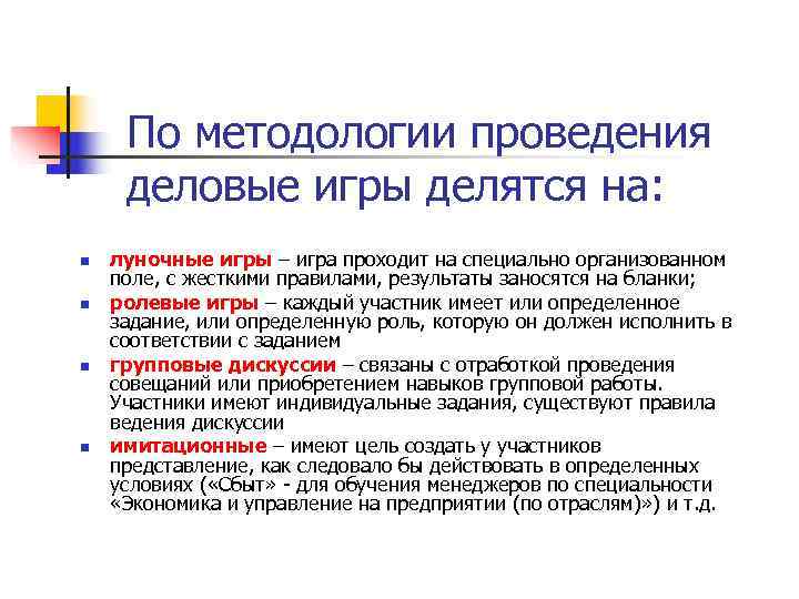 По методологии проведения деловые игры делятся на: n луночные игры – игра проходит на специально организованном поле, с жесткими правилами, результаты заносятся на бланки; n ролевые игры – каждый участник имеет или определенное задание, или определенную роль, которую он должен исполнить в соответствии с заданием n групповые дискуссии – связаны с отработкой проведения совещаний или приобретением навыков групповой работы. Участники имеют индивидуальные задания, существуют правила ведения дискуссии n имитационные – имеют цель создать у участников представление, как следовало бы действовать в определенных условиях ( «Сбыт» - для обучения менеджеров по специальности «Экономика и управление на предприятии (по отраслям)» ) и т. д.