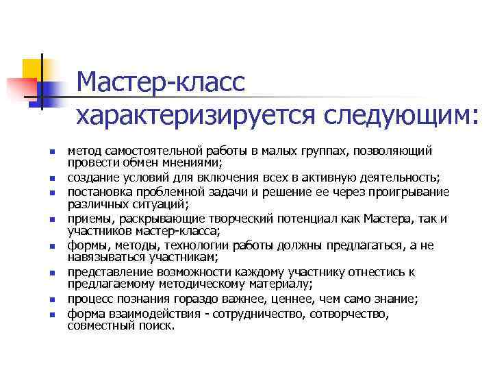Мастер-класс характеризируется следующим: n метод самостоятельной работы в малых группах, позволяющий провести обмен мнениями; n создание условий для включения всех в активную деятельность; n постановка проблемной задачи и решение ее через проигрывание различных ситуаций; n приемы, раскрывающие творческий потенциал как Мастера, так и участников мастер-класса; n формы, методы, технологии работы должны предлагаться, а не навязываться участникам; n представление возможности каждому участнику отнестись к предлагаемому методическому материалу; n процесс познания гораздо важнее, ценнее, чем само знание; n форма взаимодействия - сотрудничество, сотворчество, совместный поиск.