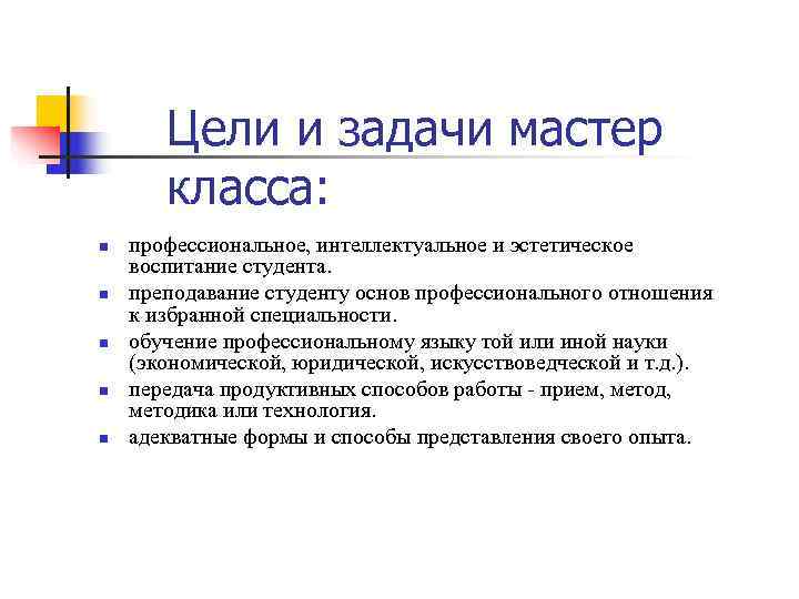 Цели и задачи мастер класса: n профессиональное, интеллектуальное и эстетическое воспитание студента. n преподавание студенту основ профессионального отношения к избранной специальности. n обучение профессиональному языку той или иной науки (экономической, юридической, искусствоведческой и т. д. ). n передача продуктивных способов работы - прием, методика или технология. n адекватные формы и способы представления своего опыта.