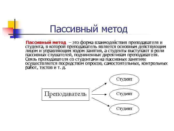 Пассивный метод – это форма взаимодействия преподавателя и студента, в которой преподаватель является основным действующим лицом и управляющим ходом занятия, а студенты выступают в роли пассивных слушателей, подчиненных директивам преподавателя. Связь преподавателя со студентами на пассивных занятиях осуществляется посредством опросов, самостоятельных, контрольных работ, тестов и т. д.