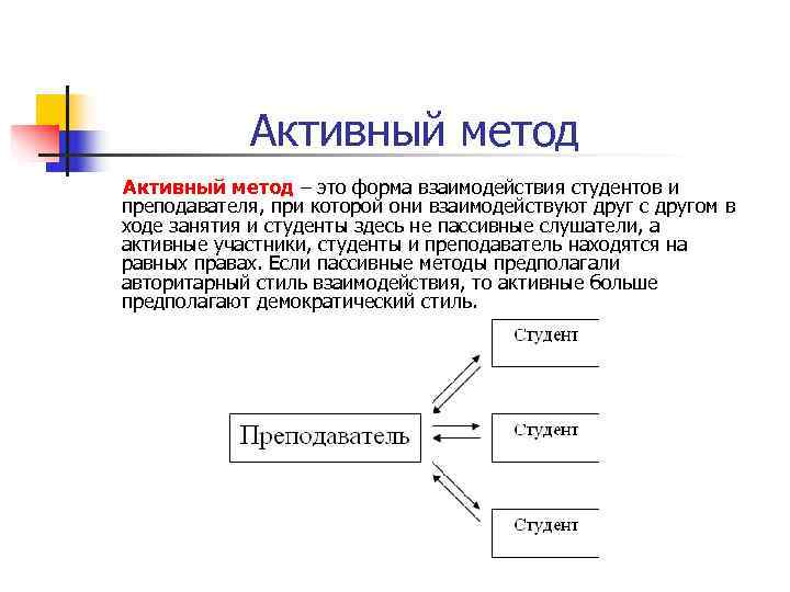 Активный метод – это форма взаимодействия студентов и преподавателя, при которой они взаимодействуют друг с другом в ходе занятия и студенты здесь не пассивные слушатели, а активные участники, студенты и преподаватель находятся на равных правах. Если пассивные методы предполагали авторитарный стиль взаимодействия, то активные больше предполагают демократический стиль.
