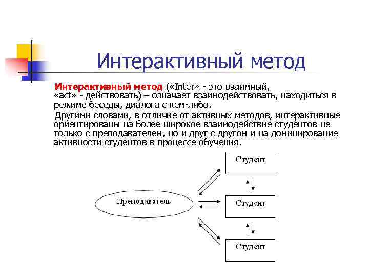 Интерактивный метод ( «Inter» - это взаимный, «act» - действовать) – означает взаимодействовать, находиться в режиме беседы, диалога с кем-либо. Другими словами, в отличие от активных методов, интерактивные ориентированы на более широкое взаимодействие студентов не только с преподавателем, но и друг с другом и на доминирование активности студентов в процессе обучения.