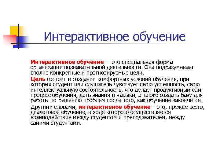 Интерактивное обучение — это специальная форма организации познавательной деятельности. Она подразумевает вполне конкретные и прогнозируемые цели. Цель состоит в создании комфортных условий обучения, при которых студент или слушатель чувствует свою успешность, свою интеллектуальную состоятельность, что делает продуктивным сам процесс обучения, дать знания и навыки, а также создать базу для работы по решению проблем после того, как обучение закончится. Другими словами, интерактивное обучение – это, прежде всего, диалоговое обучение, в ходе которого осуществляется взаимодействие между студентом и преподавателем, между самими студентами.