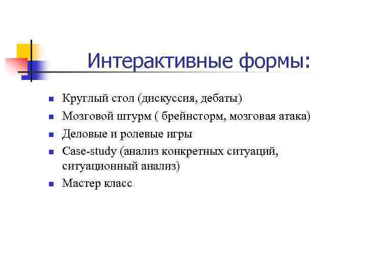 Интерактивные формы: n Круглый стол (дискуссия, дебаты) n Мозговой штурм ( брейнсторм, мозговая атака) n Деловые и ролевые игры n Case-study (анализ конкретных ситуаций, ситуационный анализ) n Мастер класс