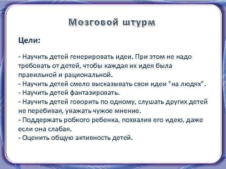 Мозговой штурм Цели: - Научить детей генерировать идеи. При этом не надо требовать от детей, чтобы каждая их идея была правильной и рациональной. - Научить детей смело высказывать свои идеи "на людях". - Научить детей фантазировать. - Научить детей говорить по одному, слушать других детей не перебивая, уважать чужое мнение. - Поддержать робкого ребенка, похвалив его идею, даже если она слабая. - Оценить общую активность детей.