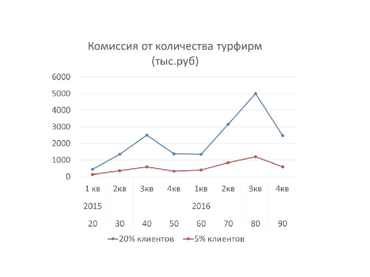 Планируемый результат Комиссия от 1 -й турфирмы (тыс. руб) 30 25 20 15 10 5 ма рт ап р. ма й ию нь ию ль ав гу ст се нт. ок но т. яб де р. кб рь . вр фе ян в. 0 20% клиентов 5% клиентов