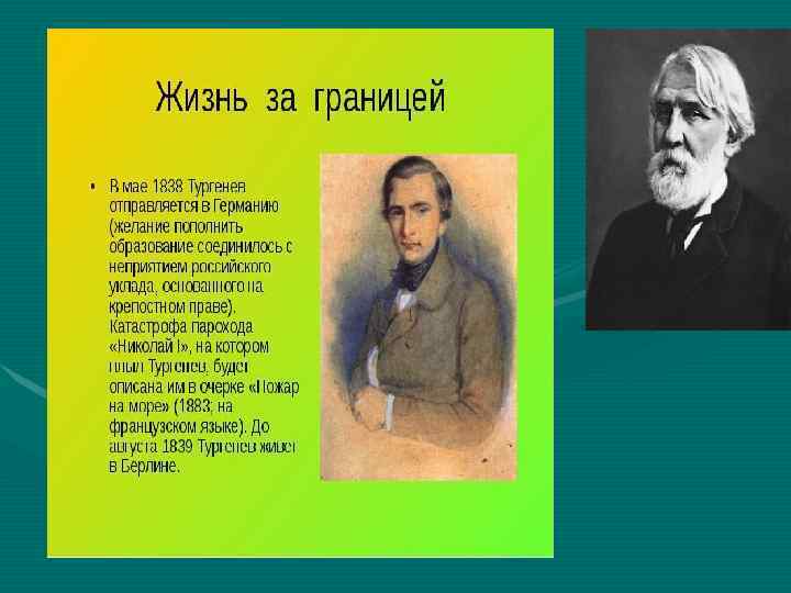 • 3. Иван Сергеевич Тургенев считается заядлым любителем поэтических вечеров. • 4. Интересные факты о Тургеневе говорят также, что имел шокирующий внешний вид: золотистые пуговицы на синем фраке либо яркий галстук с жакетом. • 5. Первой любовью Тургенева была княгиня Шаховская. Эта женщина вскоре отдала свое предпочтение отцу Тургенева. • 6. Ударяясь головой, Тургенев мог потерять сознание, потому что его теменная кость была тонкой. • 7. Над Иваном Сергеевичем в школе издевались, обзывая «мягкотелым» . • 8. Учеба Тургенева проходила в Германии. Т у р г е н е в