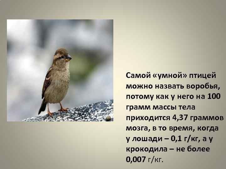 Самой «умной» птицей можно назвать воробья, потому как у него на 100 грамм массы тела приходится 4, 37 граммов мозга, в то время, когда у лошади – 0, 1 г/кг, а у крокодила – не более 0, 007 г/кг.