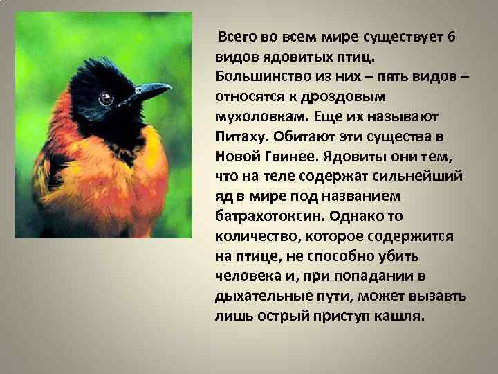 Всего во всем мире существует 6 видов ядовитых птиц. Большинство из них – пять видов – относятся к дроздовым мухоловкам. Еще их называют Питаху. Обитают эти существа в Новой Гвинее. Ядовиты они тем, что на теле содержат сильнейший яд в мире под названием батрахотоксин. Однако то количество, которое содержится на птице, не способно убить человека и, при попадании в дыхательные пути, может вызавть лишь острый приступ кашля.