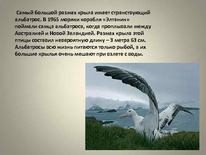 Самый большой размах крыла имеет странствующий альбатрос. В 1965 моряки корабля «Элтанин» поймали самца альбатроса, когда проплывали между Австралией и Новой Зеландией. Размах крыла этой птицы составил невероятную длину – 3 метра 63 см. Альбатросы всю жизнь питаются только рыбой, а их большие крылья очень мешают при взлете с воды.