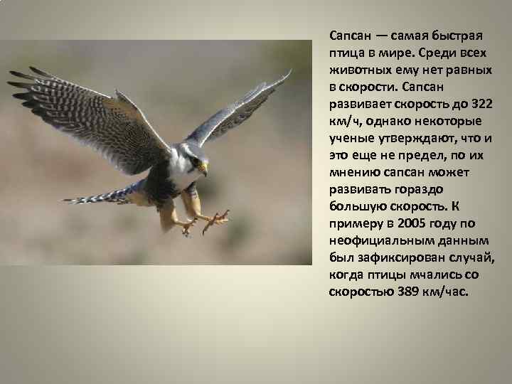 Сапсан — самая быстрая птица в мире. Среди всех животных ему нет равных в скорости. Сапсан развивает скорость до 322 км/ч, однако некоторые ученые утверждают, что и это еще не предел, по их мнению сапсан может развивать гораздо большую скорость. К примеру в 2005 году по неофициальным данным был зафиксирован случай, когда птицы мчались со скоростью 389 км/час.
