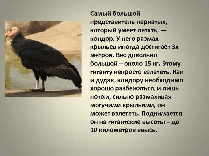 Самый большой представитель пернатых, который умеет летать, — кондор. У него размах крыльев иногда достигает 3 х метров. Вес довольно большой – около 15 кг. Этому гиганту непросто взлететь. Как и дудак, кондору необходимо хорошо разбежаться, и лишь потом, сильно размахивая могучими крыльями, он может взлететь. Поднимается он на гигантские высоты – до 10 километров ввысь.