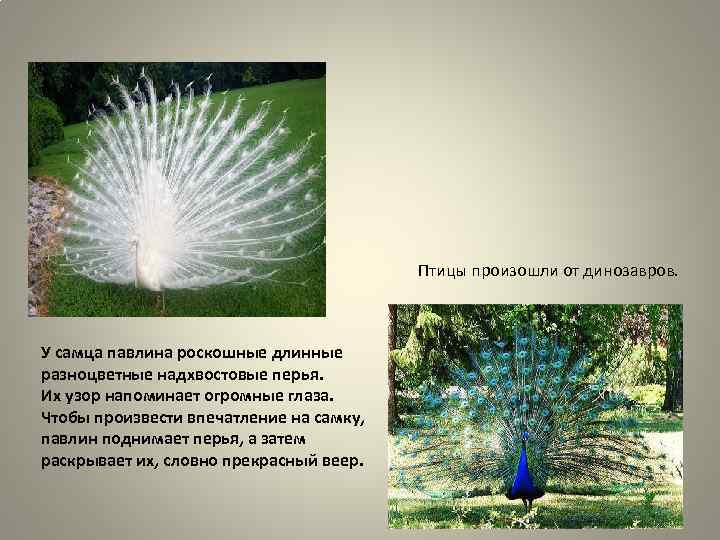 Птицы произошли от динозавров. У самца павлина роскошные длинные разноцветные надхвостовые перья. Их узор напоминает огромные глаза. Чтобы произвести впечатление на самку, павлин поднимает перья, а затем раскрывает их, словно прекрасный веер.