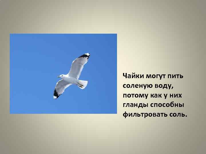 Чайки могут пить соленую воду, потому как у них гланды способны фильтровать соль.