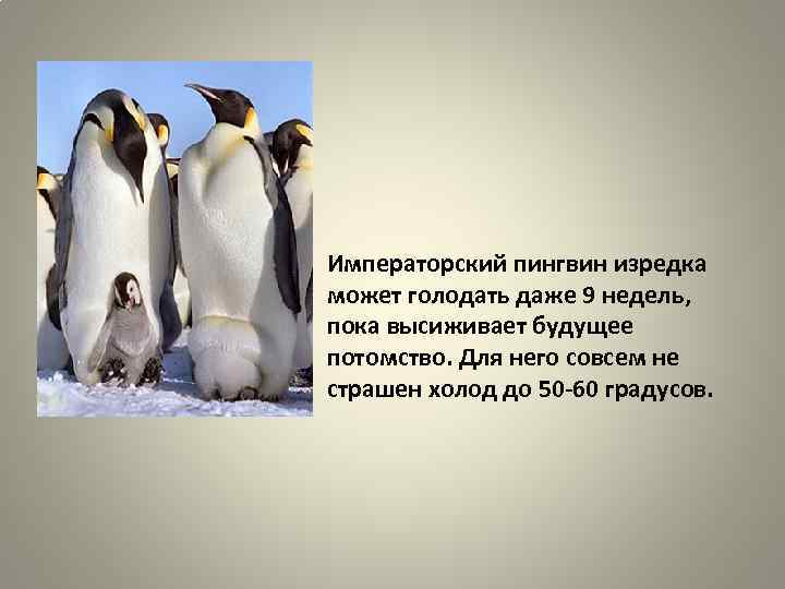 Императорский пингвин изредка может голодать даже 9 недель, пока высиживает будущее потомство. Для него совсем не страшен холод до 50 -60 градусов.